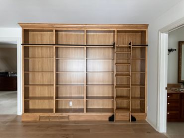 This built in bookshelf was built from scratch for a homeowner in Chagrin Falls, Ohio. The shelf includes a rolling ladder to reach the high shelves.